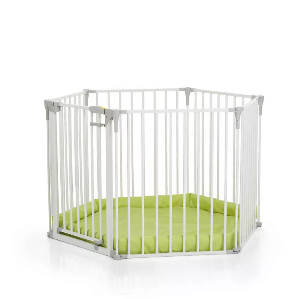 Манеж-трансформер Hauck baby Park (цена 16 000 р) состоит из пяти перегородок, имеет форму шестиугольника, создает пространство в 122 см. в последующем можно ими ограждать опасные зоны, например камин или газовую плиту. Легко разбирается и собирается. Дверца открывается в обе стороны. рассчитан на длительную эксплуатацию и имеет в комплекте специальный матрас.