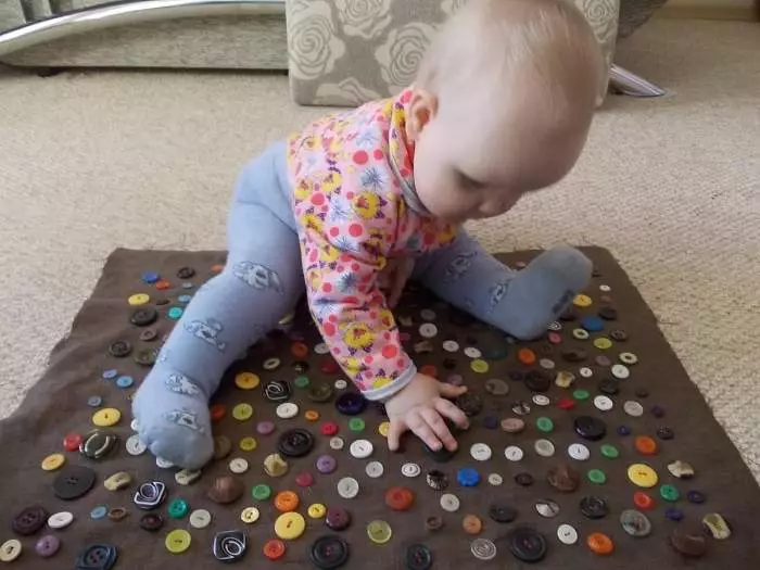 Такая незамысловатая игрушка придется по душе маленьким детям. Пришейте на кусочек ткани пуговицы различных цветов и форм. Изучение такого изделия хорошо поможет ребенку развить мелкую моторику. Используйте крупные пуговицы, выполненные из разных материалов. Во время игры с ковриком обязательно будьте рядом с малышом!