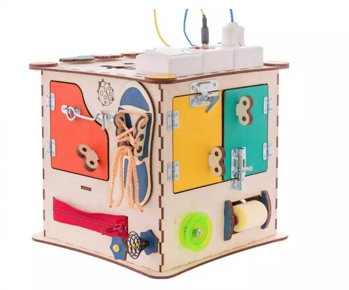 Помимо бизиборда из кусков фанеры можно смастерить бизикуб. Такой вариант более сложен в исполнении, но на этой игрушке можно разместить больше развивающих элементов.