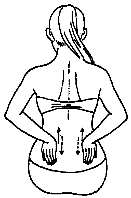 СХЕМА: Для проведения самомассажа спины необходимо сесть на табурет и обхватить левой рукой правый бок спины, а правой – левый. Для массажа этой части тела можно использовать поглаживание, похлопывание и растирание. Для того чтобы «проработать» труднодоступные участки спины можно использовать специально разработанный для этого массажер. Двигаться нужно от области крестца как можно выше к лопаткам.