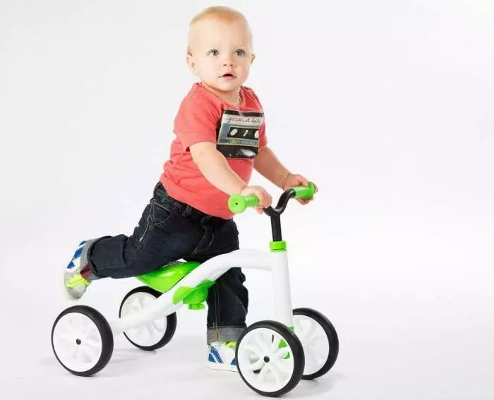 - Ребенку ещене исполнилось двух лет? Лучший вариант – беговел из прочного пластика, с четырьмя колесами. Хорошо, если весить он будет не более 3 кг. Пригодится бардачок для детских вещей и ручка для переноса самого транспорта.