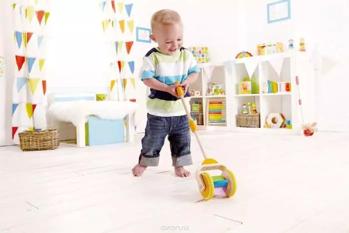 Поскольку ребенок уже начал ходить, но может делать это не совсем уверенно, пригодится игрушка-каталка. Она может иметь замысловатый привлекательный вид. К примеру, есть модель в виде бабочки, которая начинает хлопать крыльями, как только малыш приводит игрушку в действие.