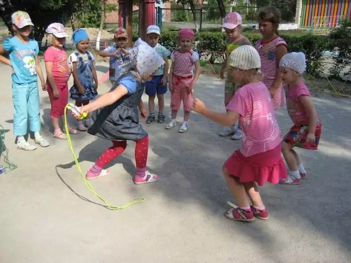 - «Удочка». Дети становятся круг. Ведущий берет скакалку и крутит ее так, чтобы она не касалась земли. Игроки должны подпрыгнуть, избегая прикосновения ног к скакалке, иначе выбывают из игры.