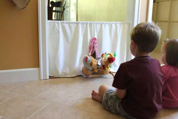 Вам не терпится провести театрализованное представление, а времени в обрез? Сделайте ширму на скорую руку. Для этого достаточно повесить ткань на верёвку и зафиксировать ее в дверном проеме. Используйте ненужный материал, вырезав в нем окошко.ОСОБЕННОСТИ!Проведите театрализованное представление на свежем воздухе. Такое времяпровождение не только подарит хорошее настроение малышу, но и пойдет ему на пользу.Если вы не хотите портить ткань, можно не делать в ней отверстие. В таком случае куклы в спектакле будут располагаться над ширмой.