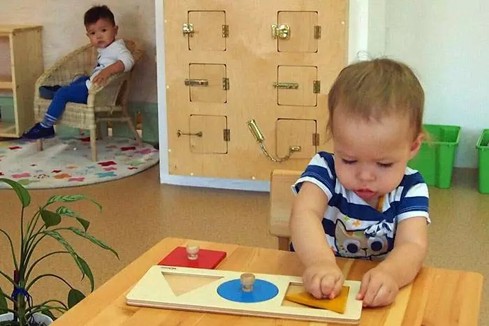 Детский сад Монтессори — это, прежде всего, обучающая среда. Класс разделен на зоны: зона развития крупной моторики, зона практической жизни — кулинария, стирка, глажка, зона развития речи, математики, сенсорики, мелкой моторики. Все материалы доступны детям, и они свободно выбирают то, что им необходимо.