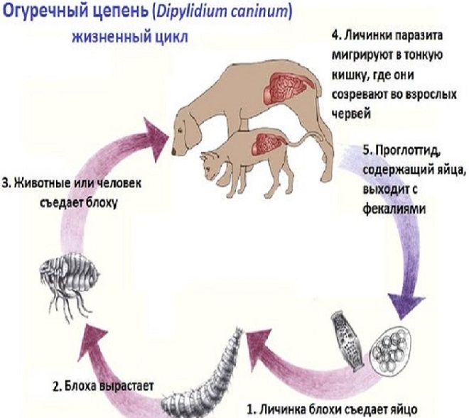 Именно в теле блохи или клеща из яиц развиваются цистицеркоиды – инвазионная форма паразита. Животным свойственно вылизывать шерсть и выкусывать паразитов. Собственно, так и происходит повторное заражение животного огуречным цепнем. Человек может заразиться только в том случае, если случайно проглотит блоху.