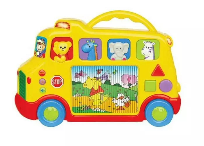 Яркая и многофункциональная игрушка, обязательно привлечет внимание вашего малыша. Наличие множества геометрических фигур поможет развить ловкость рук ребенка, а разнообразие животных в автобусе — память и логику. В конструкции игрушки также присутствует «телевизор», изображение которого меняется. Более того, игрушечный транспорт музыкальный: при нажатии определенных кнопок звучит разная музыка.