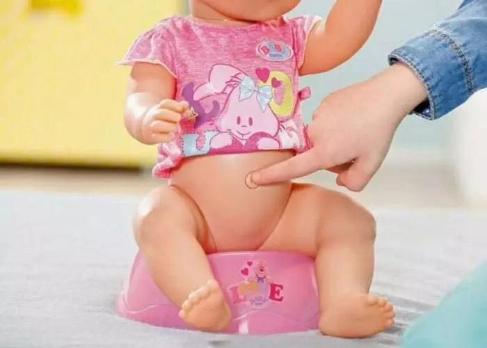 - Ходить в туалет.Эта модель детской игрушки имеет даже такую возможность. Для этого нужно посадить кукольного младенца на унитаз и нажать на кнопочку.