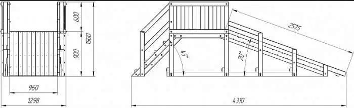 - монтируется лестница: края двух досок спиливают под углом 45 градусов, прикручивают их к поперечному брусу спусковой площадки. Между собой эти доски фиксируются при помощи ступенек. Оптимальный шаг между ступенями составляет 25-35 см. Далее устанавливаются балясины, к которым крепятся перила;