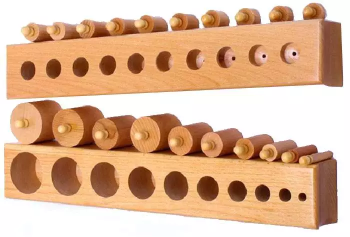 Среди самых распространенных являетсяигрушка в системе Монтессори– счетные цилиндры. С помощью нее можно дать понять ребенку о том, что все цилиндры даже одной длины могут быть разного диаметра (то есть размера), они по-разному весят и не во все отверстия могут поместиться. Например, самый маленький может поместиться в любое, а вот самый большой, только на свое законное место. Для взрослых эти простые понятия не являются чем-то необычным, но дети, будут искать зависимость и набираться опыта, пытаясь раз за разом вставить большой цилиндр на другое место.
