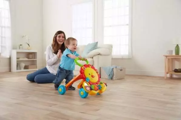 - Каталка: является более безопасным вариантом, так как ребенок опирается на конструкцию и толкает ее вперед. У малыша не возникает трения, нагрузка на позвоночник значительно снижается. Использовать ходунки-каталку разрешено только после 10-12 месяцев, когда кроха уже довольно уверенно стоит на ножках. Родители сами должны увидеть, когда можно ходунки ребенку.