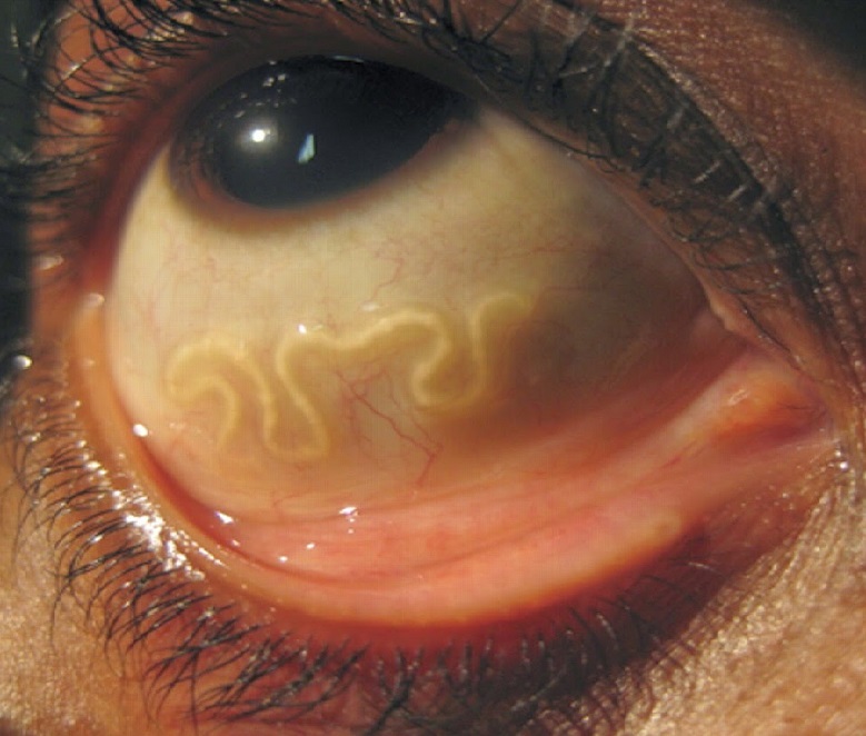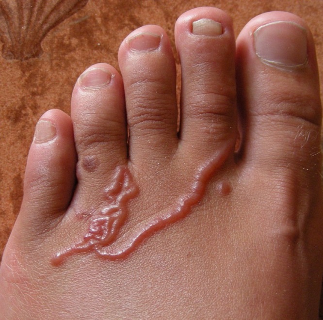 Находящийся под кожей червь выглядит как канатик, который имеет извитый вид, при этом он возвышается над кожным покровом. Кроме этого, наблюдаются отечность и ярко-красный цвет пораженного места. Также при прикосновении проявляются боль и сильный зуд. Поэтому место поражения достаточно просто заметить.