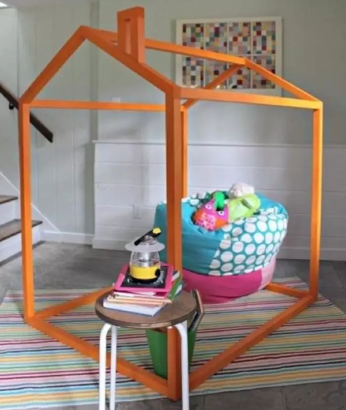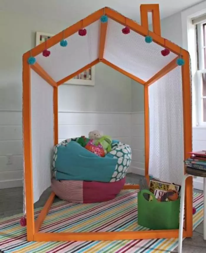 Еще один вариант изготовления игрового домика – этодомик-палатка. Конструкция отлично впишется в детскую комнату и станет настоящим украшением интерьера.