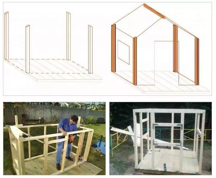 Теперь переходим к стенам. Для этого по углам созданного нами фундамента вырываем ямы. Сюда и будут установлены брусья. Дополнительно они понадобятся в тех местах, где будут окна и двери. Для того, чтобы каркас был более крепкий, можно воспользоваться металлическими уголками. Чем будут зашиваться стены в дальнейшем – завит от вашего желания.Совет!В качестве облицовочного материала может быть использована фанера или же облицовочные доски.