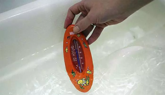 Как определить температуру воды. Для этого можно использовать специальный термометр для ванночки или старый проверенный способ – локоть. Локоть опускается в воду, и если он ничего особенного не чувствует, значит вода подходит для купания малыша.