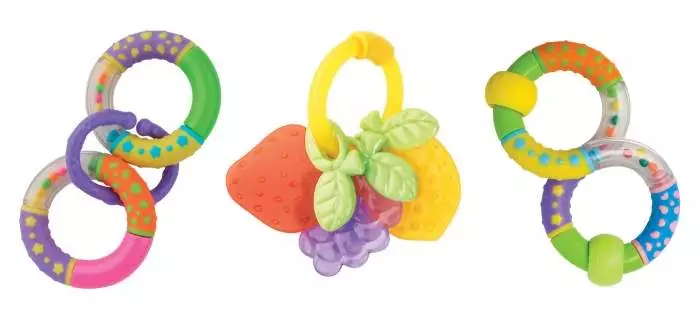 - погремушки с ручкой или на кольце, которые ребенок может держать в руке. Возрастная категория: 3+ месяцев;